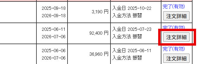 1. 会員ページにログインして下さい。ログインはこちらから 2. 注文履歴から該当の注文番号の「注文詳細」ボタンをクリックして下さい。